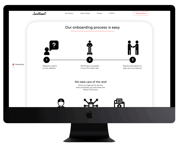 Within a 2 week sprint, the challenge was to help Sunvessel rethink and deploy a new approach to reach investors. The start up has the ambitious goal of improving mobilization in Miami by becoming a standard amenity in hotels, offices & residential buildings. I was not given a specific objective but through the UX process was able to discover my own. By the end of the project, I redesigned their website, changed its main call to action and developed a new on-boarding process called a “digital sales pitch”.